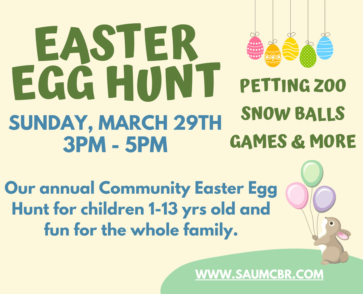 Easter Egg Hunt March 29, 2026 3:00 pm – 5:00 pm Join us for our Community Easter Egg Hunt for children (1 to 13 years old) and activities for the whole family, like a petting zoo, sno-balls, music just to name a few. All are welcome to join us!
